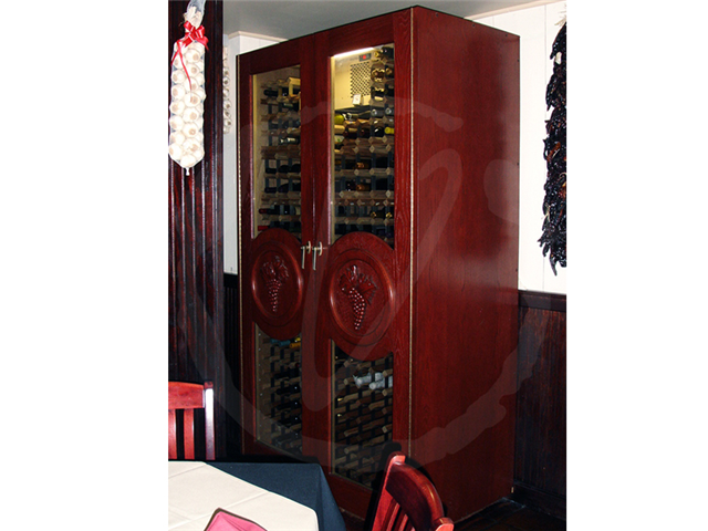 Two glass doors with hand-carved grape motif on each door, Dual-paned glass doors. Bottle capacity: 440