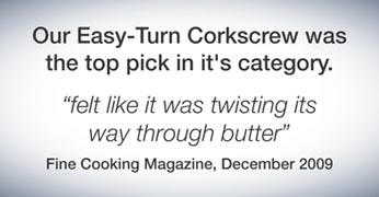 Easy Turn Corkscrew with Spring AssistBuilt in Spring removes the cork without tugging; Simply turn the Wing Handle and the cork easily comes out.SKU: WO4705 Please chose the color *Please selectEasy Turn Corkscrew with Spring Assist RedEasy Turn Corkscrew with Spring Assist BlackRegular Price: $49.99Price: $39.95 Qty: Buy Now Ship toSelect countryUnited StatesCanadaAfghanistanAlbaniaAlgeriaAmerican SamoaAndorraAngolaAnguillaAntarcticaAntigua and BarbudaArgentinaArmeniaArubaAustraliaAustriaAzerbaijanBahamasBahrainBangladeshBarbadosBelarusBelgiumBelizeBeninBermudaBhutanBoliviaBosnia and HerzegowinaBotswanaBouvet IslandBrazilBritish Indian Ocean TerritoryBrunei DarussalamBulgariaBurkina FasoBurundiCambodiaCameroonCape VerdeCayman IslandsCentral African RepublicChadChileChinaChristmas IslandCocos (Keeling) IslandsColombiaComorosCongoCook IslandsCosta RicaCote D'IvoireCroatiaCubaCyprusCzech RepublicDenmarkDjiboutiDominicaDominican RepublicEcuadorEgyptEl SalvadorEquatorial GuineaEritreaEstoniaEthiopiaFalkland Islands (Malvinas)Faroe IslandsFijiFinlandFranceFrench GuianaFrench PolynesiaFrench Southern TerritoriesGabonGambiaGeorgiaGermanyGhanaGibraltarGreeceGreenlandGrenadaGuadeloupeGuamGuatemalaGuineaGuinea-bissauGuyanaHaitiHeard and Mc Donald IslandsHondurasHong KongHungaryIcelandIndiaIndonesiaIran (Islamic Republic of)IraqIrelandIsraelItalyJamaicaJapanJordanKazakhstanKenyaKiribatiKoreaKorea, Democratic People's Republic ofKuwaitKyrgyzstanLao People's Democratic RepublicLatviaLebanonLesothoLiberiaLibyan Arab JamahiriyaLiechtensteinLithuaniaLuxembourgMacauMacedoniaMadagascarMalawiMalaysiaMaldivesMaliMaltaMarshall IslandsMartiniqueMauritaniaMauritiusMayotteMexicoMicronesiaMoldovaMonacoMongoliaMontenegroMontserratMoroccoMozambiqueMyanmarNamibiaNauruNepalNetherlandsNetherlands AntillesNew CaledoniaNew ZealandNicaraguaNigerNigeriaNiueNorfolk IslandNorthern Mariana IslandsNorwayOmanPakistanPalauPanamaPapua New GuineaParaguayPeruPhilippinesPitcairnPolandPortugalPuerto RicoQatarReunionRomaniaRussiaRwandaSaint Kitts and NevisSaint LuciaSaint Vincent and the GrenadinesSamoaSan MarinoSao Tome and PrincipeSaudi ArabiaSenegalSerbiaSeychellesSierra LeoneSingaporeSlovakia (Slovak Republic)SloveniaSolomon IslandsSomaliaSouth AfricaSouth Georgia & South Sandwich IslandsSpainSri LankaSt. HelenaSt. Pierre and MiquelonSudanSurinameSvalbard and Jan Mayen IslandsSwazilandSwedenSwitzerlandSyrian Arab RepublicTaiwanTajikistanTanzaniaThailandTogoTokelauTongaTrinidad and TobagoTunisiaTurkeyTurkmenistanTurks and Caicos IslandsTuvaluUgandaUkraineUnited Arab EmiratesUnited KingdomUnited States minor outlying islandsUruguayUzbekistanVanuatuVatican City State (Holy See)VenezuelaViet NamVirgin Islands (British)Virgin Islands (U.S.)Wallis and Futuna IslandsWestern SaharaYemenZambiaZimbabwe *Other *Shipping MethodNameEstimated DeliveryPriceNo shipping optionsApply Custom wishlist OKAdd to wishlistAdd to compare listUnique design!No tugging with spring assist!Easy-turn with spring assist makes it effortless!Brilliant polished metal handle with easy grip wings.Six blade foil cutter includedUPC: 886245003552Spring Assist:Built in Spring removes the cork without tugging; Simply turn the Wing Handle and the cork easily comes out.Turn the opposite way & spring assist ejects the cork.Tension Guide:The first turn will be as easy and smooth as the last.A Special Weighted Design:centers automatically on bottlemaximizes stabilityadds pressure for penetrating corksOverviewReviewsContact UsUnique design!No tugging with spring assist!Easy-turn with spring assist makes it effortless!Brilliant polished metal handle with easy grip wings.Six blade foil cutter includedUPC: 886245003552Spring Assist:Built in Spring removes the cork without tugging; Simply turn the Wing Handle and the cork easily comes out.Turn the opposite way & spring assist ejects the cork.Tension Guide:The first turn will be as easy and smooth as the last.A Special Weighted Design:centers automatically on bottlemaximizes stabilityadds pressure for penetrating corksWrite your own reviewOnly registered users can write reviewsReview title: * Review text: * Rating:Bad ExcellentSubmit reviewYour name * Your email * Enquiry * Submit