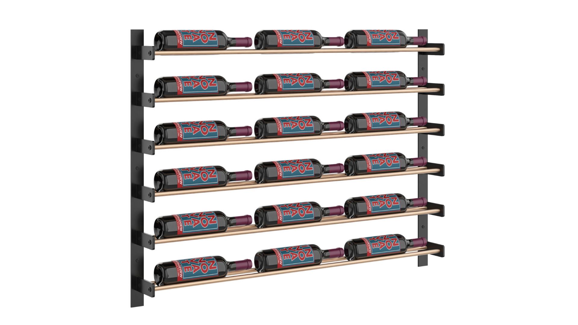 The Wine Wall 45 is a 9-bottle tall x 3 bottle wide wine rack that stands on its own as an amazing wall-mounted wine display and can be lined up with other heights to create a custom-sized display to fit your space.