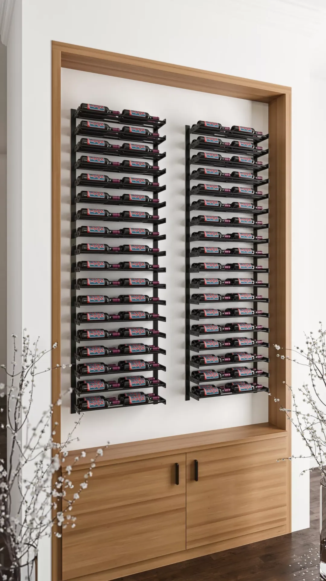 At just a bottle tall, the Evolution Wine Wall 5 2C is perfect on its own for a small wine display above a wet bar or near a kitchen or the ultimate customization piece to reach an exact display height by stacking above any other 2C (two column) Wine Wall model.