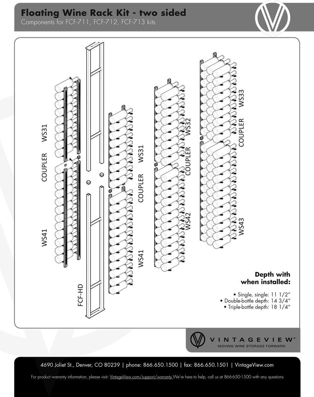 42 - Bottles, Double Sided Wall Series Floating Wine Rack KitVintageView, Floating Wine Rack Kit (2 Sided, 42 bottles), This two-sided floor-to-ceiling mounting wine rack configuration is a prefect kit to create room dividers or push displays up against glass walls in stunning fashion.SKU: FCF-KIT-711 Depth Single,(42 bottles) FCF-KIT-711 Finish * Black Stain,K Brushed Nickle, P Chrome Lux, Lux Ch [+$485.00] Golden Bronze Lux GB [+$630.00] Gun Metal GM [+$709.00] $1,170.00 Qty: Buy Now Ship toSelect countryUnited StatesCanadaAfghanistanAlbaniaAlgeriaAmerican SamoaAndorraAngolaAnguillaAntarcticaAntigua and BarbudaArgentinaArmeniaArubaAustraliaAustriaAzerbaijanBahamasBahrainBangladeshBarbadosBelarusBelgiumBelizeBeninBermudaBhutanBoliviaBosnia and HerzegowinaBotswanaBouvet IslandBrazilBritish Indian Ocean TerritoryBrunei DarussalamBulgariaBurkina FasoBurundiCambodiaCameroonCape VerdeCayman IslandsCentral African RepublicChadChileChinaChristmas IslandCocos (Keeling) IslandsColombiaComorosCongoCook IslandsCosta RicaCote D'IvoireCroatiaCubaCyprusCzech RepublicDenmarkDjiboutiDominicaDominican RepublicEcuadorEgyptEl SalvadorEquatorial GuineaEritreaEstoniaEthiopiaFalkland Islands (Malvinas)Faroe IslandsFijiFinlandFranceFrench GuianaFrench PolynesiaFrench Southern TerritoriesGabonGambiaGeorgiaGermanyGhanaGibraltarGreeceGreenlandGrenadaGuadeloupeGuamGuatemalaGuineaGuinea-bissauGuyanaHaitiHeard and Mc Donald IslandsHondurasHong KongHungaryIcelandIndiaIndonesiaIran (Islamic Republic of)IraqIrelandIsraelItalyJamaicaJapanJordanKazakhstanKenyaKiribatiKoreaKorea, Democratic People's Republic ofKuwaitKyrgyzstanLao People's Democratic RepublicLatviaLebanonLesothoLiberiaLibyan Arab JamahiriyaLiechtensteinLithuaniaLuxembourgMacauMacedoniaMadagascarMalawiMalaysiaMaldivesMaliMaltaMarshall IslandsMartiniqueMauritaniaMauritiusMayotteMexicoMicronesiaMoldovaMonacoMongoliaMontenegroMontserratMoroccoMozambiqueMyanmarNamibiaNauruNepalNetherlandsNetherlands AntillesNew CaledoniaNew ZealandNicaraguaNigerNigeriaNiueNorfolk IslandNorthern Mariana IslandsNorwayOmanPakistanPalauPanamaPapua New GuineaParaguayPeruPhilippinesPitcairnPolandPortugalPuerto RicoQatarReunionRomaniaRussiaRwandaSaint Kitts and NevisSaint LuciaSaint Vincent and the GrenadinesSamoaSan MarinoSao Tome and PrincipeSaudi ArabiaSenegalSerbiaSeychellesSierra LeoneSingaporeSlovakia (Slovak Republic)SloveniaSolomon IslandsSomaliaSouth AfricaSouth Georgia & South Sandwich IslandsSpainSri LankaSt. HelenaSt. Pierre and MiquelonSudanSurinameSvalbard and Jan Mayen IslandsSwazilandSwedenSwitzerlandSyrian Arab RepublicTaiwanTajikistanTanzaniaThailandTogoTokelauTongaTrinidad and TobagoTunisiaTurkeyTurkmenistanTurks and Caicos IslandsTuvaluUgandaUkraineUnited Arab EmiratesUnited KingdomUnited States minor outlying islandsUruguayUzbekistanVanuatuVatican City State (Holy See)VenezuelaViet NamVirgin Islands (British)Virgin Islands (U.S.)Wallis and Futuna IslandsWestern SaharaYemenZambiaZimbabwe *Other *Shipping MethodNameEstimated DeliveryPriceNo shipping optionsApply Custom wishlist OKAdd to wishlistAdd to compare listEasily display your wine collection anywhere with the Floating Wall Wine Rack Kit, featuring our patented Wall Series metal wine racks and companion framing system. This two-sided configuration is a prefect kit to create room dividers or push displays up against glass walls in the must visually stunning way imaginable. Constructed of commercial-grade steel, the Floating Wall Wine Rack Kit comes with everything you need to assemble a two-sided floating wine rack.This display holds 42, standard wine bottles dependent on bottle depth.Add more capacity with additional Wall Series rackingInstall multiple columns to show off a collection of any size.Specifics:DIMENSIONS & BOTTLE CAPACITY:MINIMALIST WINE STORAGE: Take your wine collection off the wall by creating a two-sided floating wine rack. Frame, 7-feet of Wall Series wine racks (4 pieces), hardware to install Wine Racks to Frame, and welded Base Plates included.Single bottle deep: H:120″ x W:13″ x D:11.5” (42 bottles)DURABLE MATERIAL & SLEEK FINISH: Built with commercial-grade steel, backed by a lifetime warranty, and available in satin black, brushed nickel, and chrome finishes.FLOOR-TO-CEILING SUPPORT: Get the wine rack support you need without compromising style. Create unique, two-sided installations against windows or fragile tile.KEY FEATURES: This wine rack kit is easy-to-install in your home and is up to 10 feet tall when assembled.MOVING WINE STORAGE FORWARD: At VintageView, we create the preferred wine racks for design professional sand design-focused DIYers.OverviewReviewsContact UsEasily display your wine collection anywhere with the Floating Wall Wine Rack Kit, featuring our patented Wall Series metal wine racks and companion framing system. This two-sided configuration is a prefect kit to create room dividers or push displays up against glass walls in the must visually stunning way imaginable. Constructed of commercial-grade steel, the Floating Wall Wine Rack Kit comes with everything you need to assemble a two-sided floating wine rack.This display holds 42, standard wine bottles dependent on bottle depth.Add more capacity with additional Wall Series rackingInstall multiple columns to show off a collection of any size.Specifics:DIMENSIONS & BOTTLE CAPACITY:MINIMALIST WINE STORAGE: Take your wine collection off the wall by creating a two-sided floating wine rack. Frame, 7-feet of Wall Series wine racks (4 pieces), hardware to install Wine Racks to Frame, and welded Base Plates included.Single bottle deep: H:120″ x W:13″ x D:11.5” (42 bottles)DURABLE MATERIAL & SLEEK FINISH: Built with commercial-grade steel, backed by a lifetime warranty, and available in satin black, brushed nickel, and chrome finishes.FLOOR-TO-CEILING SUPPORT: Get the wine rack support you need without compromising style. Create unique, two-sided installations against windows or fragile tile.KEY FEATURES: This win