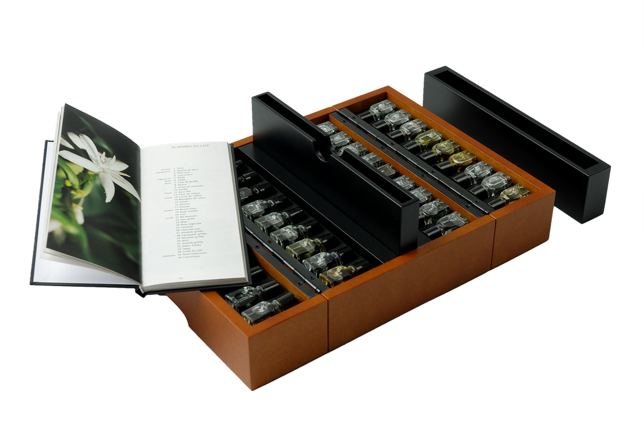 Le Nez Du Café - Revelation Kit 36 Coffee AromasTHE REFERENCE TO DEVELOP YOUR SENSE OF SMELL BY JEAN LENOIR Le Nez du Vin is the perfect training tool for olfactory memory. It is within your reach. Take it out, sit, breathe the aromas...Available in English and FrenchSKU: 36AROMCAFEFree shipping Version * English Version French Version $588.00 Qty: Buy Now Custom wishlist OKAdd to wishlistAdd to compare list36 olfactory music notes, the major ones found in the world’s coffees. The illustrated book describes the aromatic group of each aroma, its odoriferous features and its presence in the world’s coffees, as well as the art of coffee growing, roasting and brewing.An exploration as in-depth as that of wine, which will overwhelm coffee lovers. Same aromas and explanatory booklet as Le Nez du Café® Révélation. Wood box, size: 26 x 15 x 8.5 cm, weight: 1.85 kg.Made in France.The 36 aromas of Le Nez du CaféEARTHY NOTE: 1 earth. VEGETABLE NOTES: 2 potato, 3 garden peas, 4 cucumber. DRY/VEGETAL NOTE: 5 straw. WOODY NOTE: 6 cedar. SPICY NOTES: 7 clove-like, 8 pepper, 9 coriander seeds, 10 vanilla. FLORAL NOTES: 11 tea-rose/redcurrant jelly, 12 coffee blossom, 13 coffee pulp. FRUITY NOTES: 14 blackcurrant-like, 15 lemon, 16 apricot, 17 apple. ANIMAL NOTES: 18 butter, 19 honeyed, 20 leather. TOASTY NOTES: 21 basmati rice, 22 toast, 23 malt, 24 liquorice, 25 caramel, 26 dark chocolate, 27 roasted almonds, 28 roasted peanuts, 29 roasted hazelnuts, 30 walnuts, 31 cooked beef, 32 smoky note, 33 pipe tobacco, 34 roasted coffee, CHEMICAL NOTES: 35 medecinal, 36 rubber.OverviewReviewsContact Us36 olfactory music notes, the major ones found in the world’s coffees. The illustrated book describes the aromatic group of each aroma, its odoriferous features and its presence in the world’s coffees, as well as the art of coffee growing, roasting and brewing.An exploration as in-depth as that of wine, which will overwhelm coffee lovers. Same aromas and explanatory booklet as Le Nez du Café® Révélation. Wood box, size: 26 x 15 x 8.5 cm, weight: 1.85 kg.Made in France.The 36 aromas of Le Nez du CaféEARTHY NOTE: 1 earth. VEGETABLE NOTES: 2 potato, 3 garden peas, 4 cucumber. DRY/VEGETAL NOTE: 5 straw. WOODY NOTE: 6 cedar. SPICY NOTES: 7 clove-like, 8 pepper, 9 coriander seeds, 10 vanilla. FLORAL NOTES: 11 tea-rose/redcurrant jelly, 12 coffee blossom, 13 coffee pulp. FRUITY NOTES: 14 blackcurrant-like, 15 lemon, 16 apricot, 17 apple. ANIMAL NOTES: 18 butter, 19 honeyed, 20 leather. TOASTY NOTES: 21 basmati rice, 22 toast, 23 malt, 24 liquorice, 25 caramel, 26 dark chocolate, 27 roasted almonds, 28 roasted peanuts, 29 roasted hazelnuts, 30 walnuts, 31 cooked beef, 32 smoky note, 33 pipe tobacco, 34 roasted coffee, CHEMICAL NOTES: 35 medecinal, 36 rubber.Write your own reviewOnly registered users can write reviewsReview title: * Review text: * Rating:Bad ExcellentSubmit reviewYour name * Your email * Enquiry * Submit