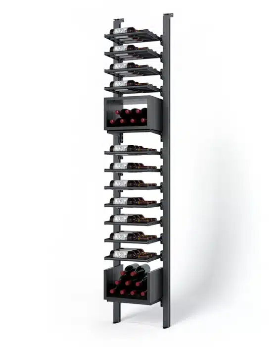 WEBKIT 14 - 52 Bottles, Modular metal wine rack- FrontenacModular metal wine rack black powder coated aluminum, Made of aluminum, it is the perfect mix of robustness and elegance. (52 bottles)SKU: WEBKIT14-14" $2,452.00 Qty: Buy Now Ship toSelect countryUnited StatesCanadaAfghanistanAlbaniaAlgeriaAmerican SamoaAndorraAngolaAnguillaAntarcticaAntigua and BarbudaArgentinaArmeniaArubaAustraliaAustriaAzerbaijanBahamasBahrainBangladeshBarbadosBelarusBelgiumBelizeBeninBermudaBhutanBoliviaBosnia and HerzegowinaBotswanaBouvet IslandBrazilBritish Indian Ocean TerritoryBrunei DarussalamBulgariaBurkina FasoBurundiCambodiaCameroonCape VerdeCayman IslandsCentral African RepublicChadChileChinaChristmas IslandCocos (Keeling) IslandsColombiaComorosCongoCook IslandsCosta RicaCote D'IvoireCroatiaCubaCyprusCzech RepublicDenmarkDjiboutiDominicaDominican RepublicEcuadorEgyptEl SalvadorEquatorial GuineaEritreaEstoniaEthiopiaFalkland Islands (Malvinas)Faroe IslandsFijiFinlandFranceFrench GuianaFrench PolynesiaFrench Southern TerritoriesGabonGambiaGeorgiaGermanyGhanaGibraltarGreeceGreenlandGrenadaGuadeloupeGuamGuatemalaGuineaGuinea-bissauGuyanaHaitiHeard and Mc Donald IslandsHondurasHong KongHungaryIcelandIndiaIndonesiaIran (Islamic Republic of)IraqIrelandIsraelItalyJamaicaJapanJordanKazakhstanKenyaKiribatiKoreaKorea, Democratic People's Republic ofKuwaitKyrgyzstanLao People's Democratic RepublicLatviaLebanonLesothoLiberiaLibyan Arab JamahiriyaLiechtensteinLithuaniaLuxembourgMacauMacedoniaMadagascarMalawiMalaysiaMaldivesMaliMaltaMarshall IslandsMartiniqueMauritaniaMauritiusMayotteMexicoMicronesiaMoldovaMonacoMongoliaMontenegroMontserratMoroccoMozambiqueMyanmarNamibiaNauruNepalNetherlandsNetherlands AntillesNew CaledoniaNew ZealandNicaraguaNigerNigeriaNiueNorfolk IslandNorthern Mariana IslandsNorwayOmanPakistanPalauPanamaPapua New GuineaParaguayPeruPhilippinesPitcairnPolandPortugalPuerto RicoQatarReunionRomaniaRussiaRwandaSaint Kitts and NevisSaint LuciaSaint Vincent and the GrenadinesSamoaSan MarinoSao Tome and PrincipeSaudi ArabiaSenegalSerbiaSeychellesSierra LeoneSingaporeSlovakia (Slovak Republic)SloveniaSolomon IslandsSomaliaSouth AfricaSouth Georgia & South Sandwich IslandsSpainSri LankaSt. HelenaSt. Pierre and MiquelonSudanSurinameSvalbard and Jan Mayen IslandsSwazilandSwedenSwitzerlandSyrian Arab RepublicTaiwanTajikistanTanzaniaThailandTogoTokelauTongaTrinidad and TobagoTunisiaTurkeyTurkmenistanTurks and Caicos IslandsTuvaluUgandaUkraineUnited Arab EmiratesUnited KingdomUnited States minor outlying islandsUruguayUzbekistanVanuatuVatican City State (Holy See)VenezuelaViet NamVirgin Islands (British)Virgin Islands (U.S.)Wallis and Futuna IslandsWestern SaharaYemenZambiaZimbabwe *Other *Shipping MethodNameEstimated DeliveryPriceNo shipping optionsApply Custom wishlist OKAdd to wishlistAdd to compare listWEBKIT MODULE 14 (52 bottles)Possibility of floor to ceiling or floor to wall mounting*. The aluminum studs are easy to cut with a saw, allowing you to adjust the height of the module to your needs.Overall dimensions 14” module: W 18 5/8” x D 12 3/4” x H 96”We suggest providing a 2 1/2 ” space around the module to facilitate its installation.COMPONENTS– 11 x triple shelves FTT-– 1 x solid birch wood U shelf FTBU-– 1 x solid birch wood bin FTBH-– 13 x standard shelf brackets FK-2AT– 2 x floor to ceiling stud 96” FPP-96– 2 x mural anchor FK-PAMOverviewReviewsContact UsWEBKIT MODULE 14 (52 bottles)Possibility of floor to ceiling or floor to wall mounting*. The aluminum studs are easy to cut with a saw, allowing you to adjust the height of the module to your needs.Overall dimensions 14” module: W 18 5/8” x D 12 3/4” x H 96”We suggest providing a 2 1/2 ” space around the module to facilitate its installation.COMPONENTS– 11 x triple shelves FTT-– 1 x solid birch wood U shelf FTBU-– 1 x solid birch wood bin FTBH-– 13 x standard shelf brackets FK-2AT– 2 x floor to ceiling stud 96” FPP-96– 2 x mural anchor FK-PAMWrite your own reviewOnly registered users can write reviewsReview title: * Review text: * Rating:Bad ExcellentSubmit reviewYour name * Your email * Enquiry * Submit