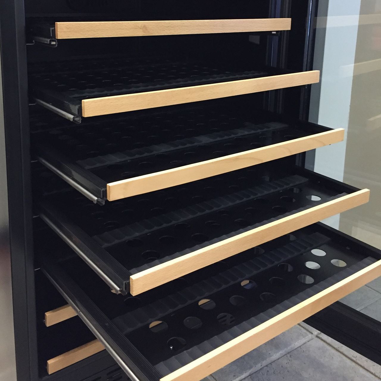 The Diamond WC166SSDZ7 is a dual-zone built-in cellar featuring internal electronic controls and one of the quietest compressors available. It includes sliding shelves mounted on ball bearings for easy access and visibility of your collection.