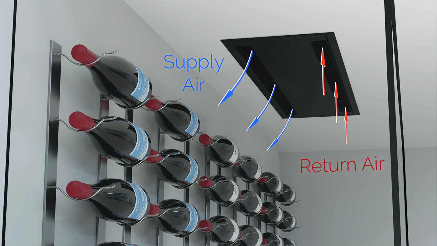 Wine Guardian ceiling mount split cooling system offers a low profile solution for ceiling mount applications. Installed in 12” or 16” joist spacing with as low as 10” joist height. Heavily insulated units are both quiet and energy efficient. Operating as low as 53 DBA.