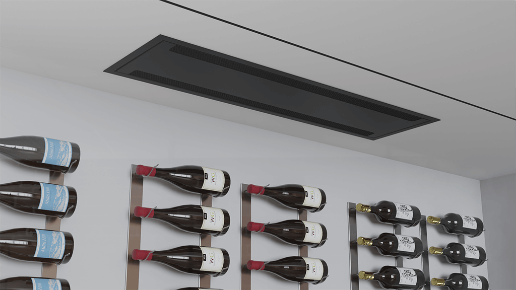 Wine Guardian ceiling mount split cooling system offers a low profile solution for ceiling mount applications. Installed in 12” or 16” joist spacing with as low as 10” joist height. Heavily insulated units are both quiet and energy efficient. Operating as low as 53 DBA.
