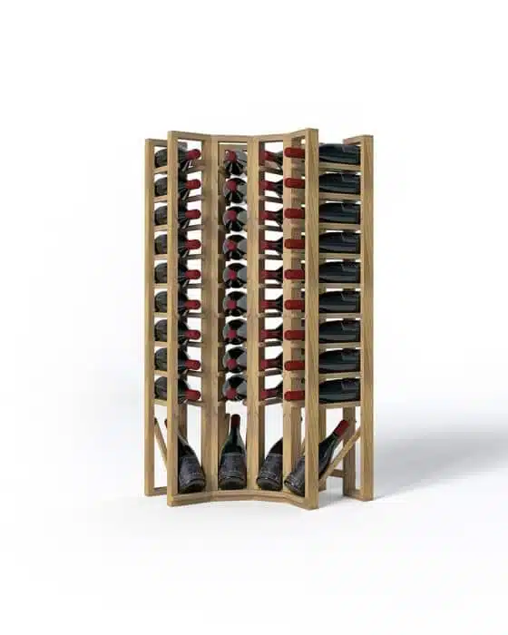 Freestanding modular corner wine rack, easy to stack to create complete arrangements. Wall mounting with an anchor for more solidity (a 5/8” gap between the wall and the rack is required). To be used with base B-COIN for more stability and a neat finish.
