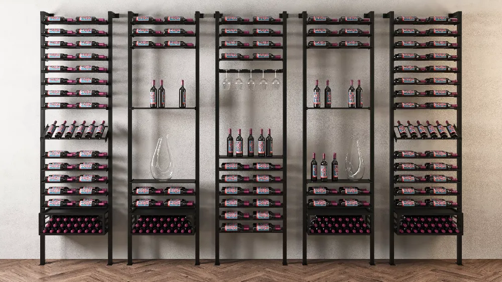 The Evolution Wine Wall collection offers a unique approach to label-forward wall mounted wine rack storage. Available in a variety of stackable heights, three bottle depths, and a standard 3-bottle wide configuration, the Wine Wall can scale to any project requirement. Plus units can link together (sharing a support) to expand to any project requirement and the racks are spaced to hold magnum, Champagne, and standard wine bottle sizes.