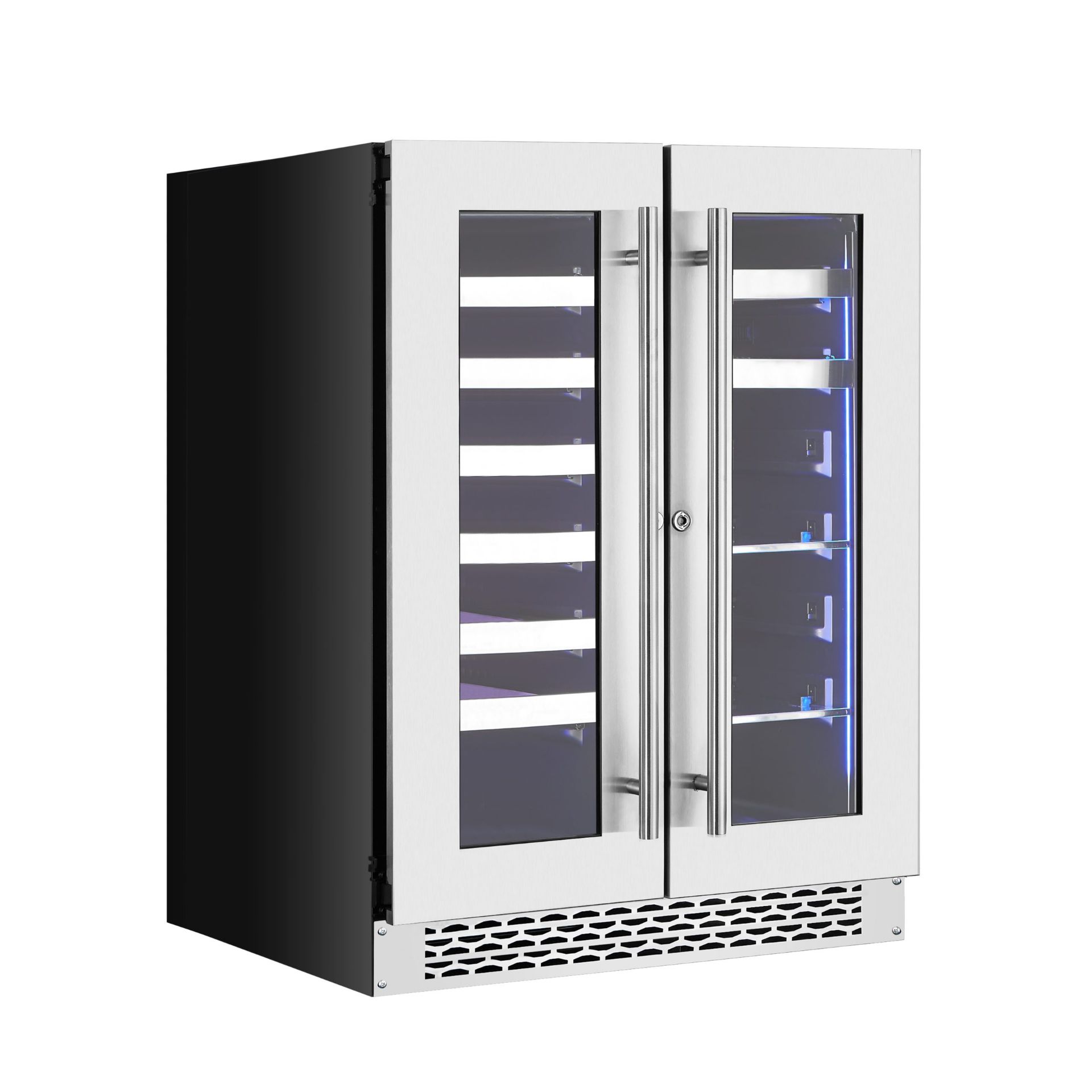 - Build: Stainless steel seamless glass door, reversible with security lock, and dual LED lighting (white and blue).